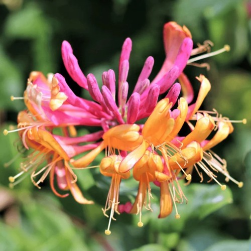 Главная причина, по которой многие стремятся купить жимолость Гекрота — её цветение. Трубчатые двухцветные цветки с розово-малиновой внешней стороной и жёлтой серединой появляются волнами с июня до осени. Аромат лёгкий, сладковатый, особенно заметен вечером и притягивает бабочек и пчёл. Цветы смотрятся эффектно как вблизи, так и на расстоянии, а позже их сменяют аккуратные декоративные ягодки.