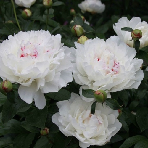 Цветки пиона Фестива Максима — это истинное наслаждение для глаз. Они относятся к махровым, розовидным сортам и обладают крупными размерами, достигая в диаметре 16-25 см. Основная окраска белая, с изящными красными мазками на центральных лепестках, а также тонкой фиолетовой каймой, что придает дополнительную привлекательность. Цветы тяжелые и плотные, с вогнутыми лепестками, структура которых настолько нежная, что кажется, будто они сделаны из самой шелковой материи. Аромат пиона приятен и стойкий, что делает его идеальным не только для сада, но и для флористических композиций, ведь срезанные цветы сохраняют свою свежесть долгое время.