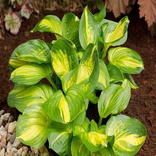Эмеральд Чарджер — это среднерослое растение, достигающее высоты около 50 см и ширины до 100 см. Куст имеет аккуратную и красивую форму, а его плотная крона создает эффектный вид на любом участке. У этого сорта характер роста побегов дуговидный, что добавляет дополнительного шарма. Листья сердцевидной формы и крупные по размеру, с глянцевой текстурой и волнистым краем, создают привлекательный контраст. Их темно-зеленая окраска по краям в сочетании с золотисто-зеленым центром делает Эмеральд Чарджер настоящим украшением вашего сада.