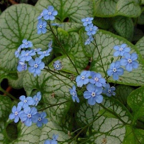Цветение приходится на апрель–май. Цветки — миниатюрные, пятилепестковые, насыщенно голубого оттенка, без навязчивого аромата. Расположены на тонких цветоносах, поднимающихся над листвой. Соцветия лёгкие, воздушные, не затмевают основное достоинство — листву, а лишь дополняют её.
